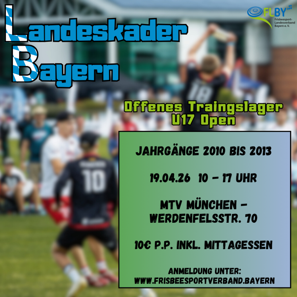 Vorankündigung: Da die bayerischen U17 Landeskader ja nun etabliert sind, wollen wir auch den U20 Spieler*innen ein Leistungssport-Angebot unterbreiten: im April oder Mai 2026 (das Datum steht noch nicht fest) planen wir einen offenen U20 Mixed-Trainingstag in München für die Jahrgänge bis 2007. Je nachdem wie der Trainingstag angenommen wird, können wir dann drangehen 2026 vielleicht weitere 2-3 Trainingstage durchzuführen. Bei großem Zuspruch werden wir evtl. versuchen einen Landeskader für U20 Mixed zu etablieren. Rückfragen bitte an kraus@frisbeesportverband.bayern