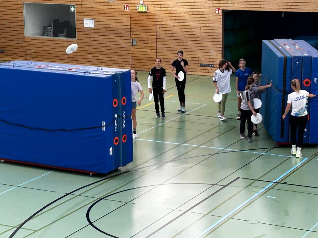 Die Frisbee-Mädels und Anja/Manu starteten pünktlich um 11 Uhr mit einer Aufwärm- und Kennenlernübung und verbrachten dann die nächsten 2 1/4 Stunden mit diversen Übungen zum Verbessern der Wurfqualität. Vor dem Mittagessen in der Mensa der Sportschule wurde dann natürlich auch eine längere Ultimate-Einheit 5:5 eingestreut. Das angebotene All-you-can-eat-Buffet war vielfältig und wurde natürlich ausreichend genutzt, ehe man vor der Nachmittagseinheit zum Kickern gegen die Landestrainer*innen verschwand.