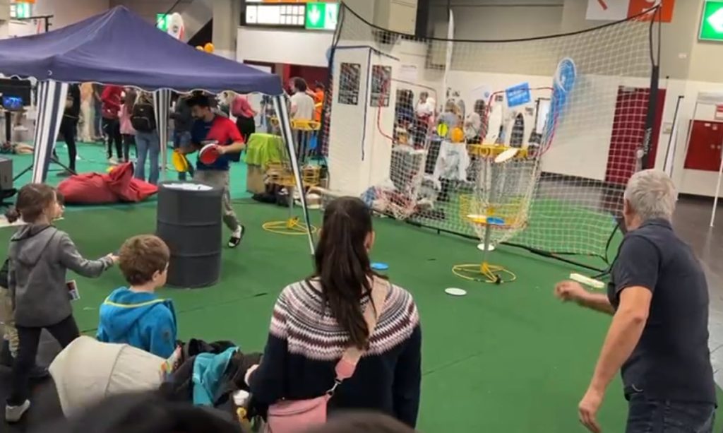 Die Disgolfer hatten eine vielbespielte TechDisc-Station im Einsatz und gaben Hilfestellung, möglichst gezielt in die Discgolf-Körbe zu treffen.