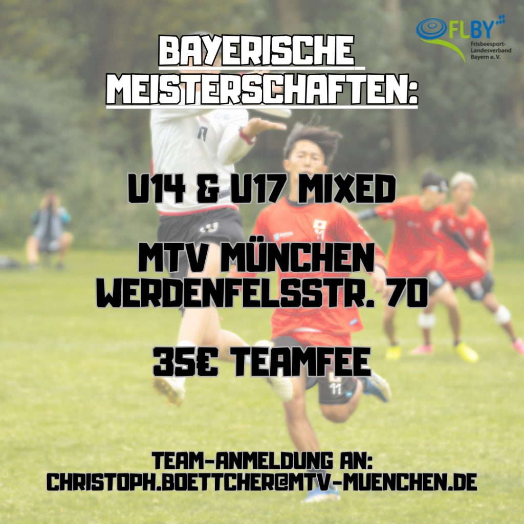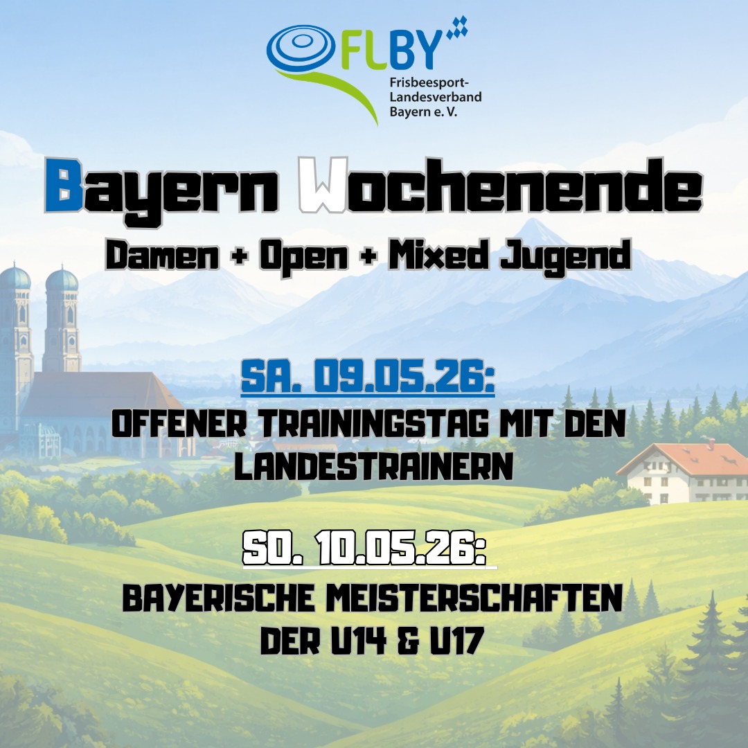 ein weiteres Angebot des FLBY zur Jugendförderung im Ultimate Frisbee steigt am Wochenende des 09./10.05.26, jeweils von 10-17 Uhr auf dem Gelände des MTV München (Werdenfelsstraße 70): das Bayern-Wochenende 2026!