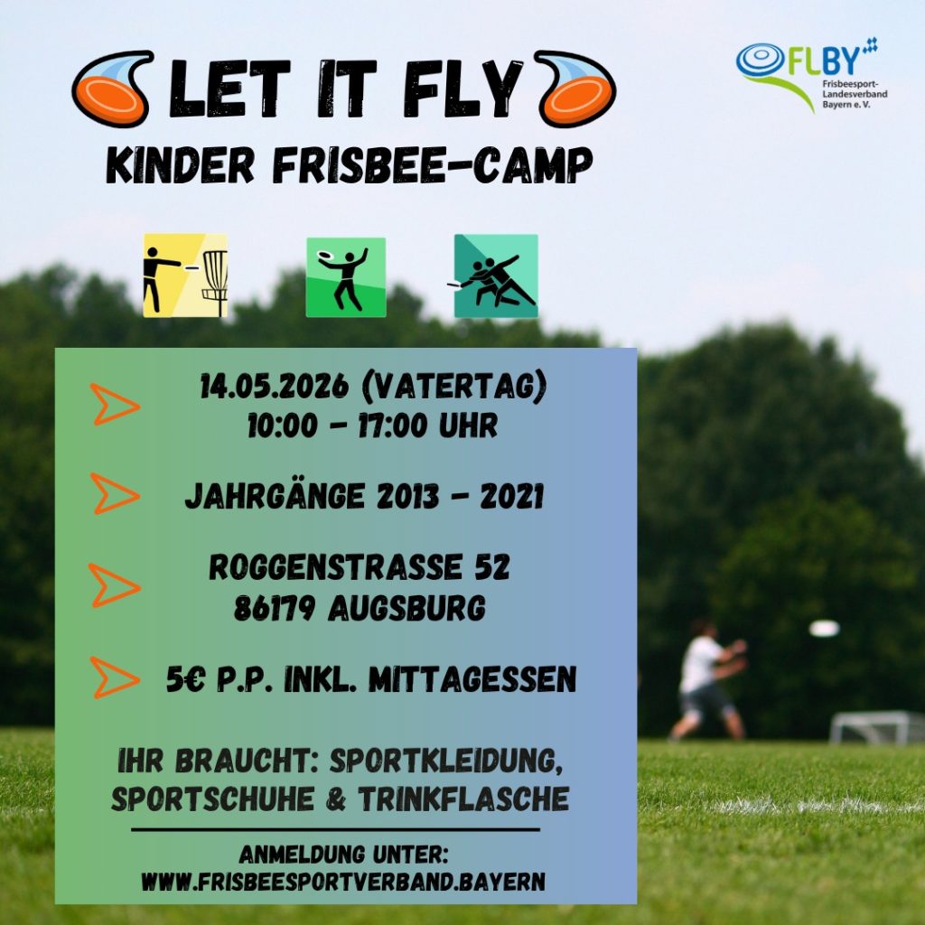 - Kinder Frisbee-Camp: Für alle jungen Frisbeesportler aus Bayern der Jahrgänge 2013 bis 2021 ist das erste Kids Frisbee-Camp des Jahres beim FC Haunstetten (Augsburg). Wie üblich thematisieren wir die Sportarten Ultimate, Discgolf und Freestyle Frisbee, die Kids werden viel Spaß haben – Ort: FC Haunstetten (Augsburg), Anmeldungen über unsere FLBY-Webseite.
