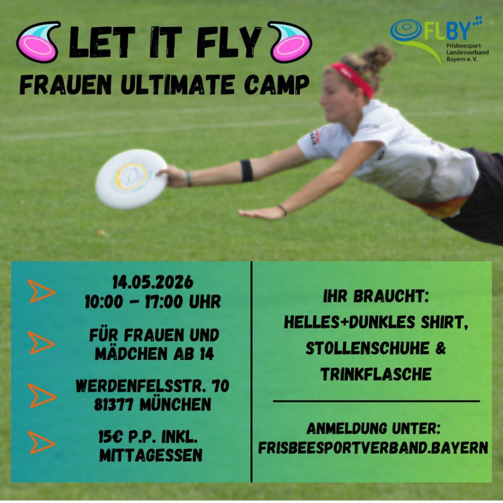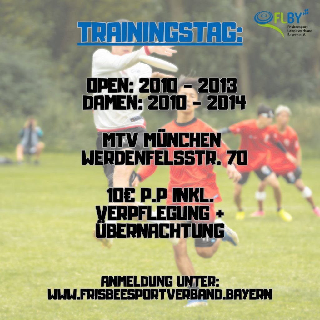 - Frauen Ultimate-Camp: Wie die letzten Jahre lädt der FLBY wieder alle Spielerinnen aus Süddeutschland ab 14 Jahren zu einem eintägigen Ultimate Frisbee-Camp beim MTV München ein. Ihr werdet einen Tag lang trainieren und spielen mit dem Ziel, Eure frisbeespezifischen Fähigkeiten zu verbessern bzw. zu vertiefen. Wobei natürlich auch das Teamplay im Fokus stehen wird – Ort: MTV München, Anmeldungen über unsere FLBY-Webseite.
