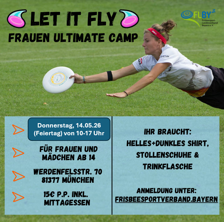 der Frisbeesport-Landesverband Bayern (FLBY) lädt alle Spielerinnen Bayern bzw. Süddeutschland und Österreich ab 14 Jahren zu einem eintägigen Ultimate Frisbee-Camp.